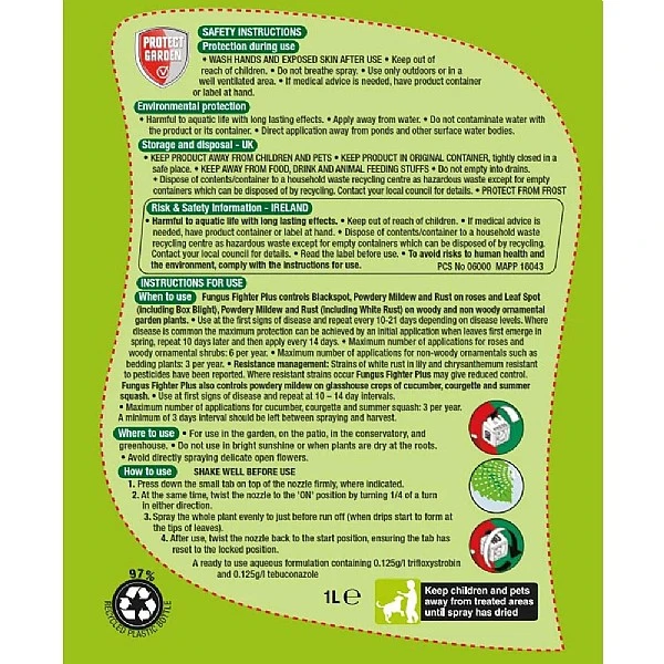 - Controls blackspot, mildew, rust, leaf spot, box blight and white rust on roses and on woody and non woody ornamental garden plants and selected edibles